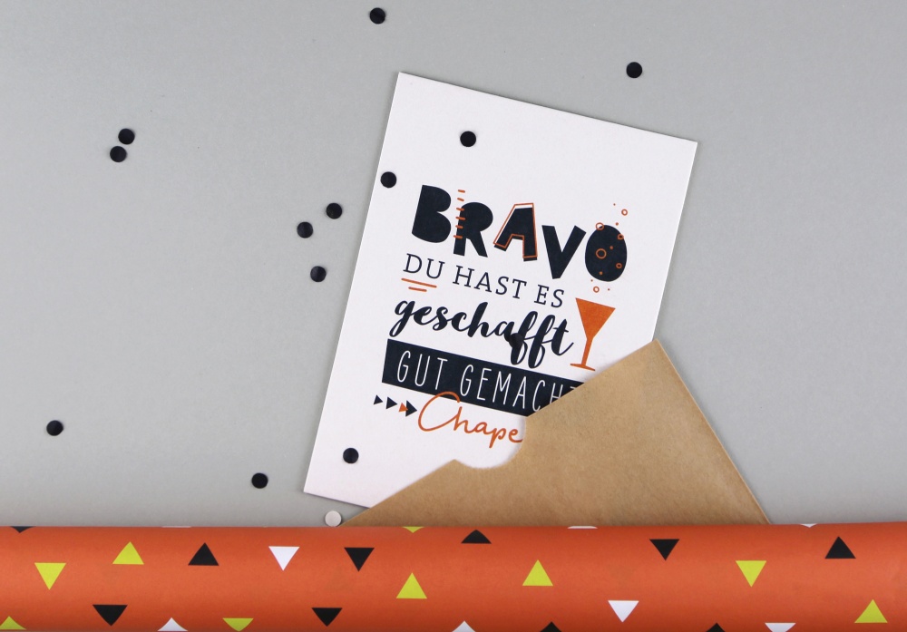Bravo – Du hast es geschafft! Ob zu einer bestandenen Prüfung, einer Abschlussarbeit oder dem Führerschein – Bruno beglückwünscht zu jedem persönlichen Meilenstein! Illustrationen und ein Mix aus verschiedenen Schriften verleihen der Karte eine moderne Optik. Die Besonderheit: Bruno ist auf 1,4 mm Holzschliffpappe (580g) gedruckt, die der Karte eine ganz besondere Haptik verleiht. Naturpapier ist sehr saugfähig, daher empfehlen wir für deine Botschaften einen Kugelschreiber oder Fineliner zu verwenden.