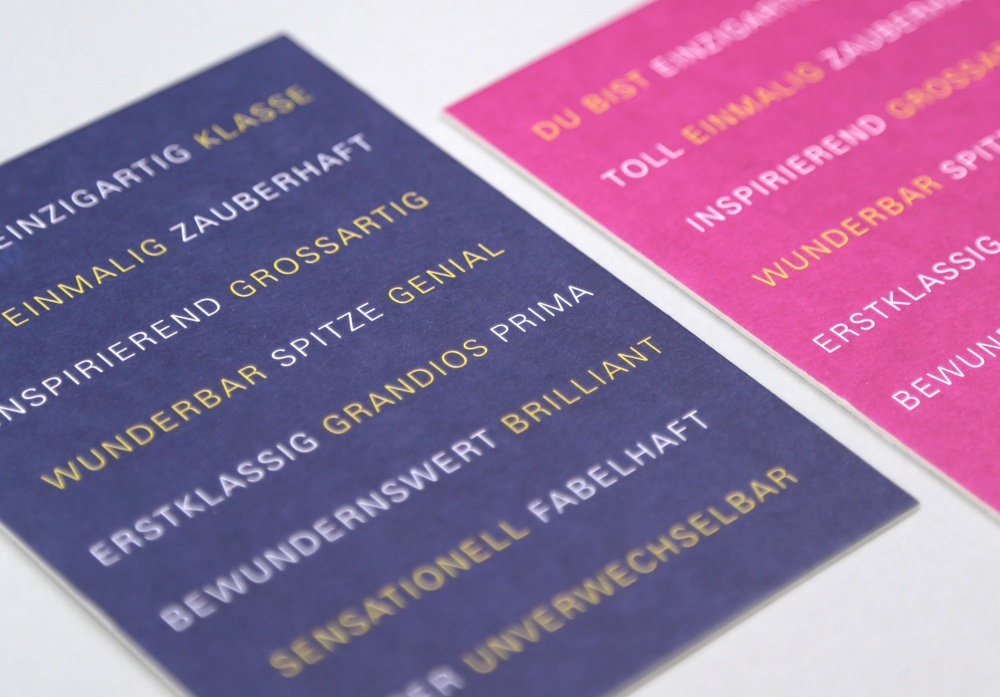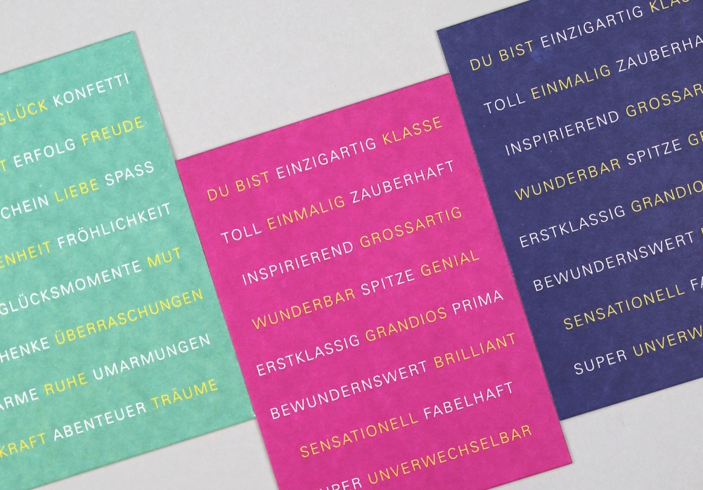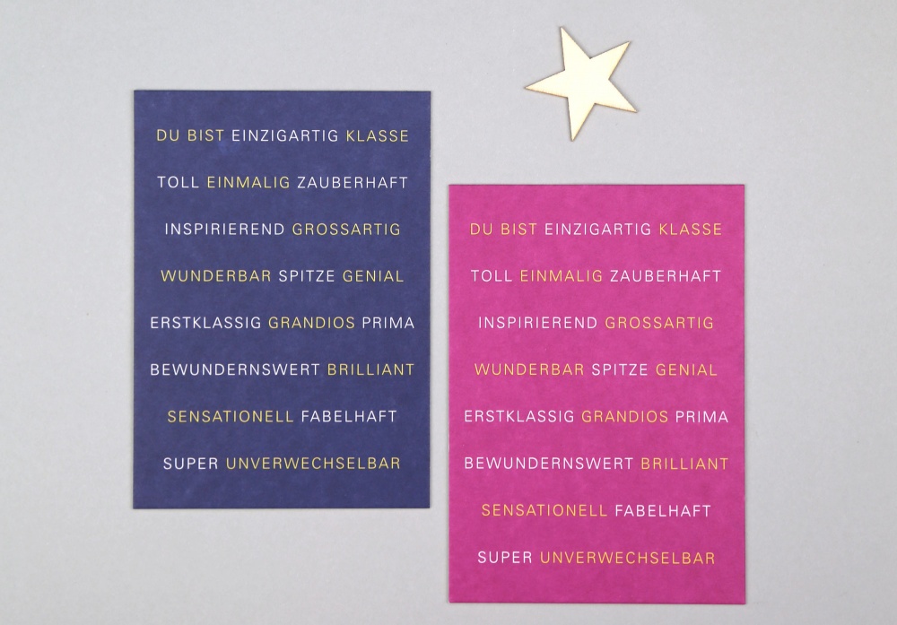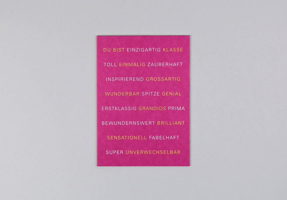 Du bist einzigartig / klasse / toll / einmalig / zauberhaft / inspirierend / grossartig / wunderbar / spitze / genial / erstklassig / grandios / prima / bewundernswert / brilliant / sensationell / fabelhaft / super / unverwechselbar / Bleib so wie du bis