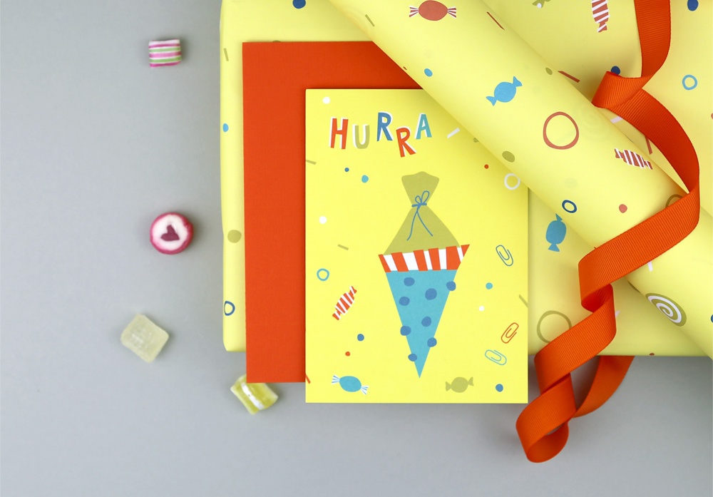 Passend zum Geschenkpapier gibt es einen Ansteckbutton, eine Schreibtischunterlage und eine Klappkarte!
